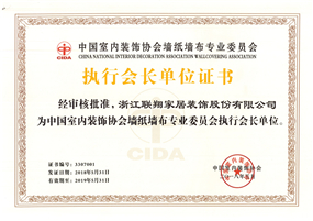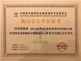 2018中國室内裝飾協會牆紙牆布專業委員會執行會長(zhǎng)單(dān)位證書