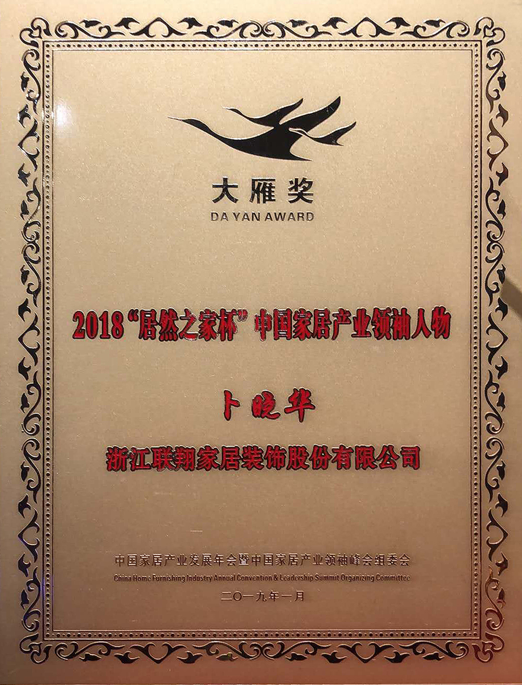 董事長蔔(bo)曉華先生蟬(chán)聯2018-2019兩屆“大雁獎”中國家居産業領袖人物;